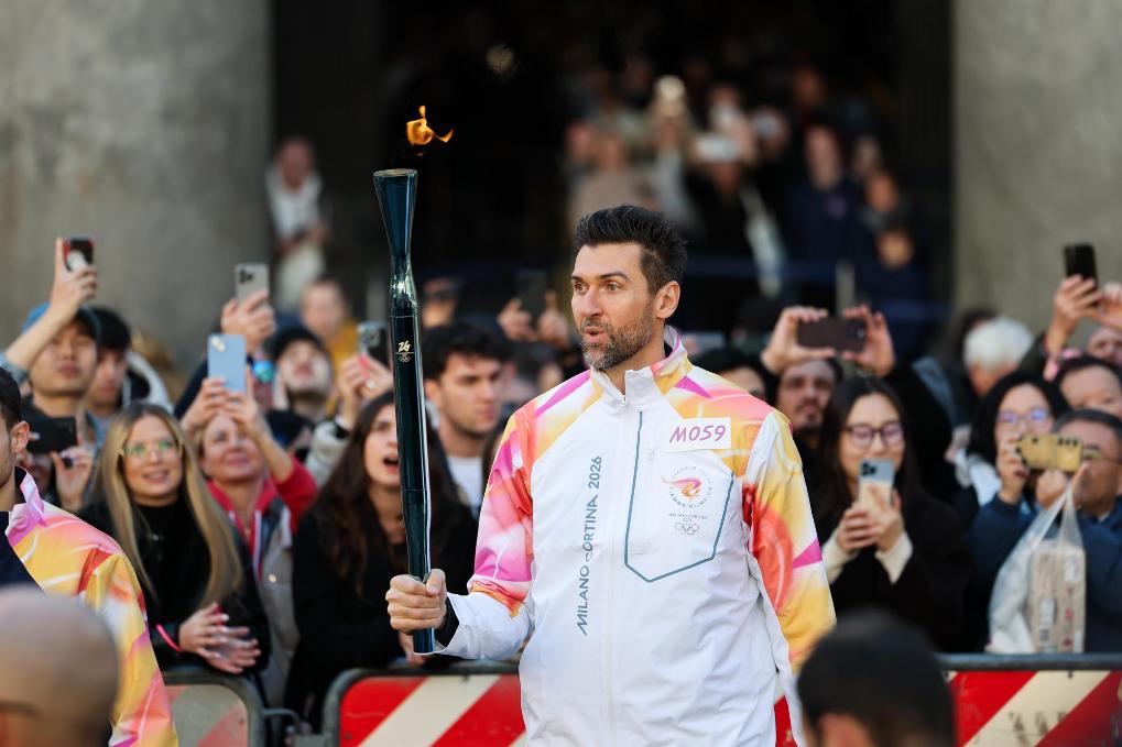 2025年12月6日,在意大利罗马万神殿,火炬手、意大利篮球运动员安德烈亚·巴尔尼亚尼在传递火炬。当日,2026年米兰-科尔蒂纳冬奥会火炬在意大利罗马传递。新华社记者李京摄